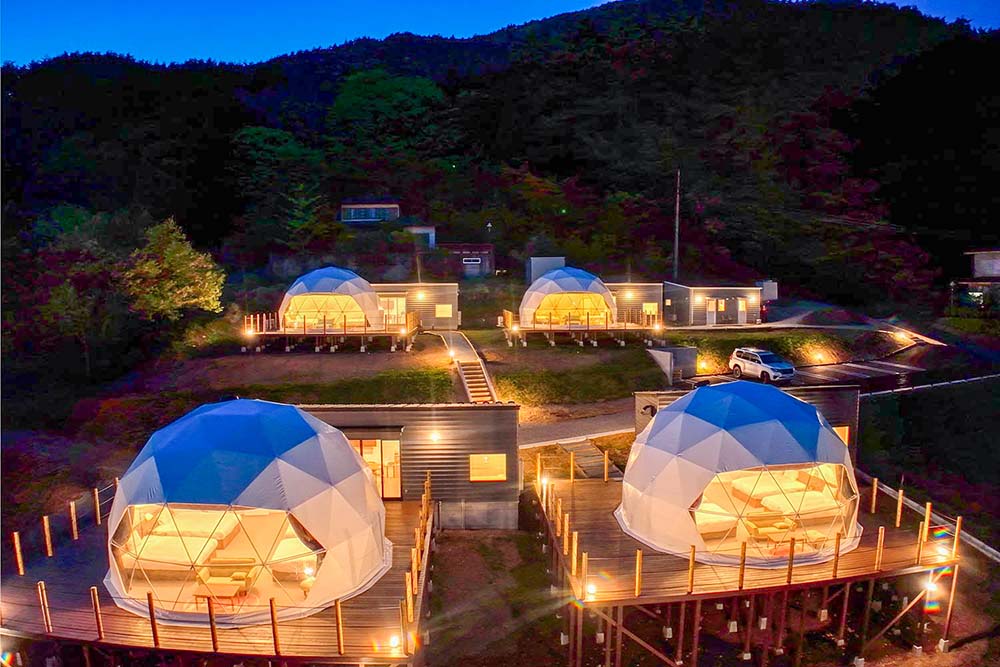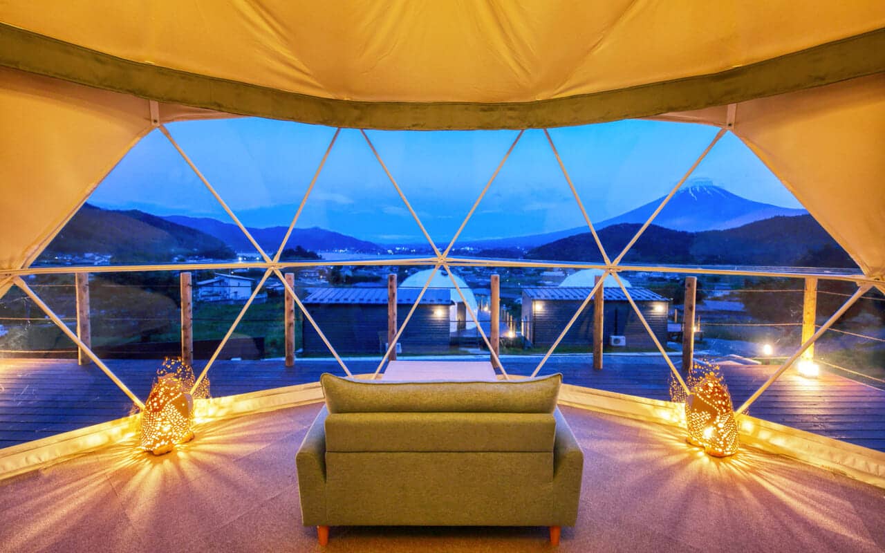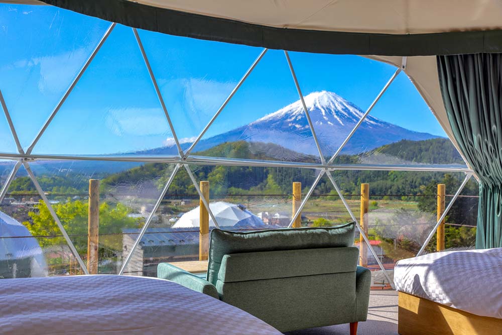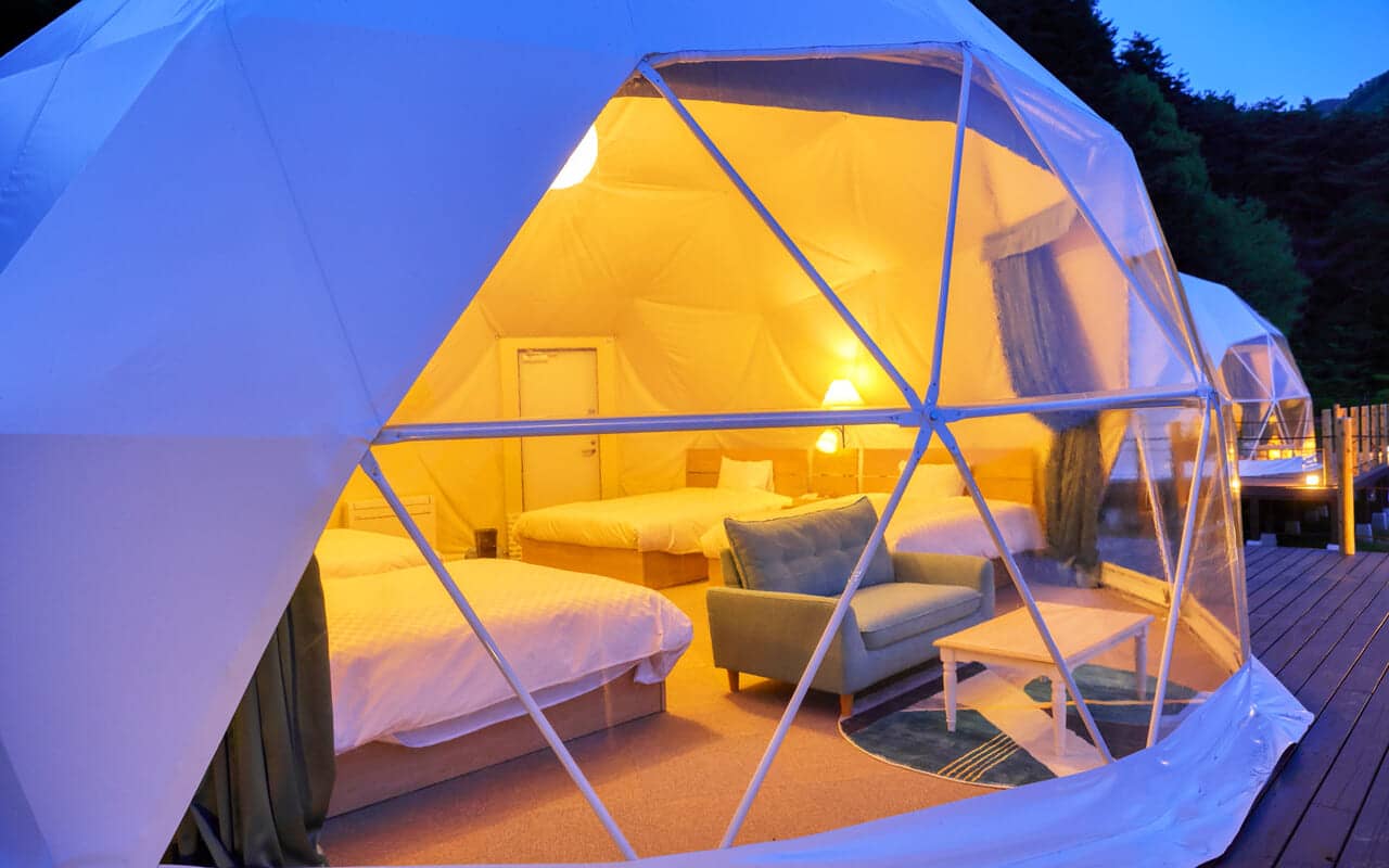 At Granfarm Fujikawaguchiko, you'll stay in your own private, spacious 7-meter dome tent. Perfect for families or groups, these large, exclusive domes offer stunning panoramic views and are equipped with air conditioning and heating, ensuring a comfortable stay year-round.