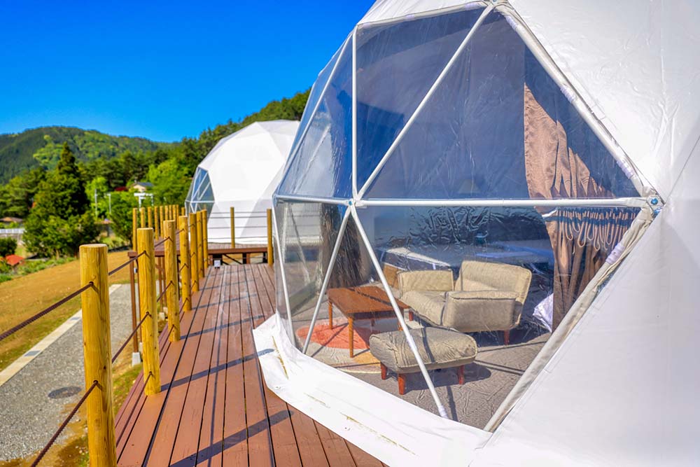 No matter the weather, your BBQ plans are safe! Each dome features a dedicated all-weather BBQ space equipped with a large gas grill. Feel free to bring your favorite ingredients from local markets or nearby supermarkets, such as fresh vegetables, local Yamanashi wine beef, or "Fuji-no-suke" fish, and create your very own custom glamping BBQ feast.